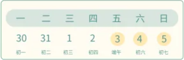 6月3日-5日為放假時(shí)間,6月6日正常上班