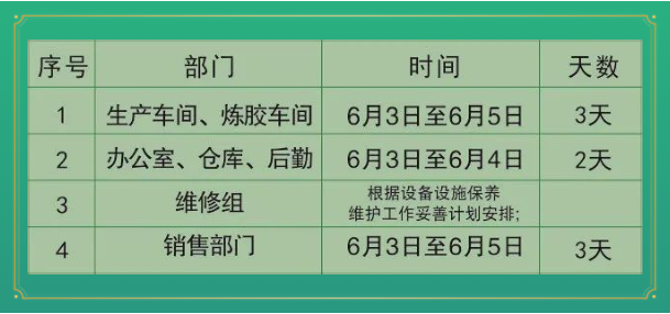 放假期間正常發(fā)貨,各部門安排人員值班,具體放假如下表: